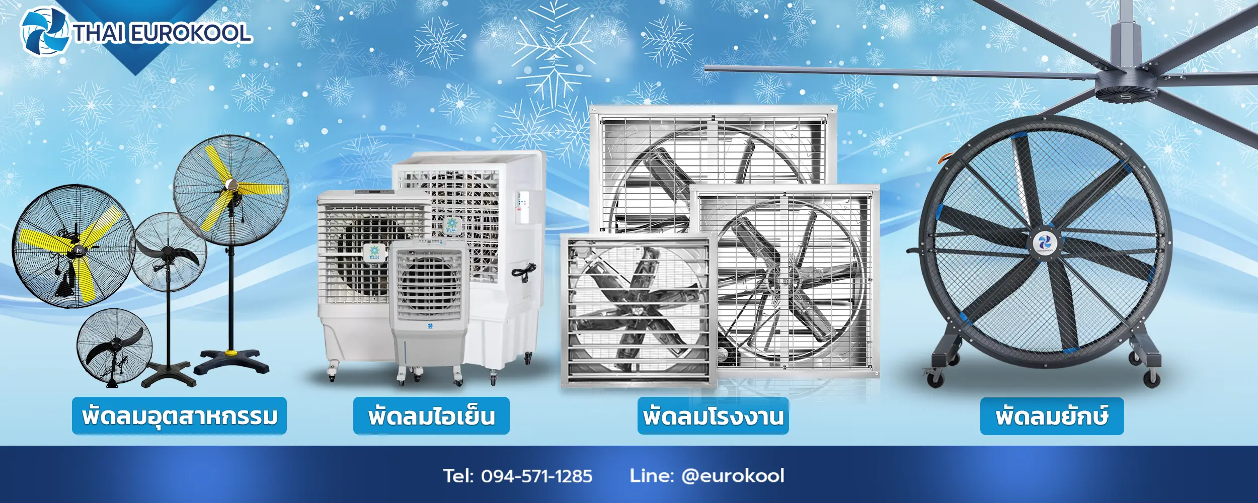 ไทยยูโรคูล คือ ผู้ผลิตและจำหน่าย พัดลมอุตสาหกรรม โดยผลิตตั้งแต่ มอเตอร์พัดลมอุตสาหกรรม โครงพัดลมอุตสาหกรรม และ อุปกรณ์ที่เกี่ยวข้อง เพื่อให้มั่นใจในกระบวนการควบคุมคุณภาพสินค้าของเรา โดยผลิตภัณฑ์และบริการของเราได้แก่ พัดลมอุตสาหกรรม, พัดลมฟาร์มและพัดลมโรงงาน, พัดลมไอเย็น, พัดลมยักษ์ HVLS , และ โบลเวอร์ ระบบระบายอากาศมาตรฐานสากล ภายใต้แบรนด์ Thai Eurokool เรามุ่งมั่นในการสร้างผลิตภัณฑ์ที่ออกแบบมาเพื่อรองรับสภาพอากาศร้อนของประเทศไทย ลดอุณหภูมิและเพิ่มคุณภาพอากาศในพื้นที่ ด้วยวัสดุที่มีคุณภาพสูง พร้อมผู้เชี่ยวชาญออกแบบผลิตภัณฑ์เพื่อให้พัดลมอุตสาหกรรมของเรา คงทน ประหยัดพลังงาน ลดต้นทุนการบำรุงรักษาในระยะยาว และมีการใช้งานที่ง่ายสะดวกปลอดภัย ภายใต้ การวิจัยและพัฒนาของบริษัท เราจึงเป็นผู้นำอันดับ 1 ในด้านพัดลมอุตสาหกรรมโครงเหล็ก และ พัดลมยักษ์ DC